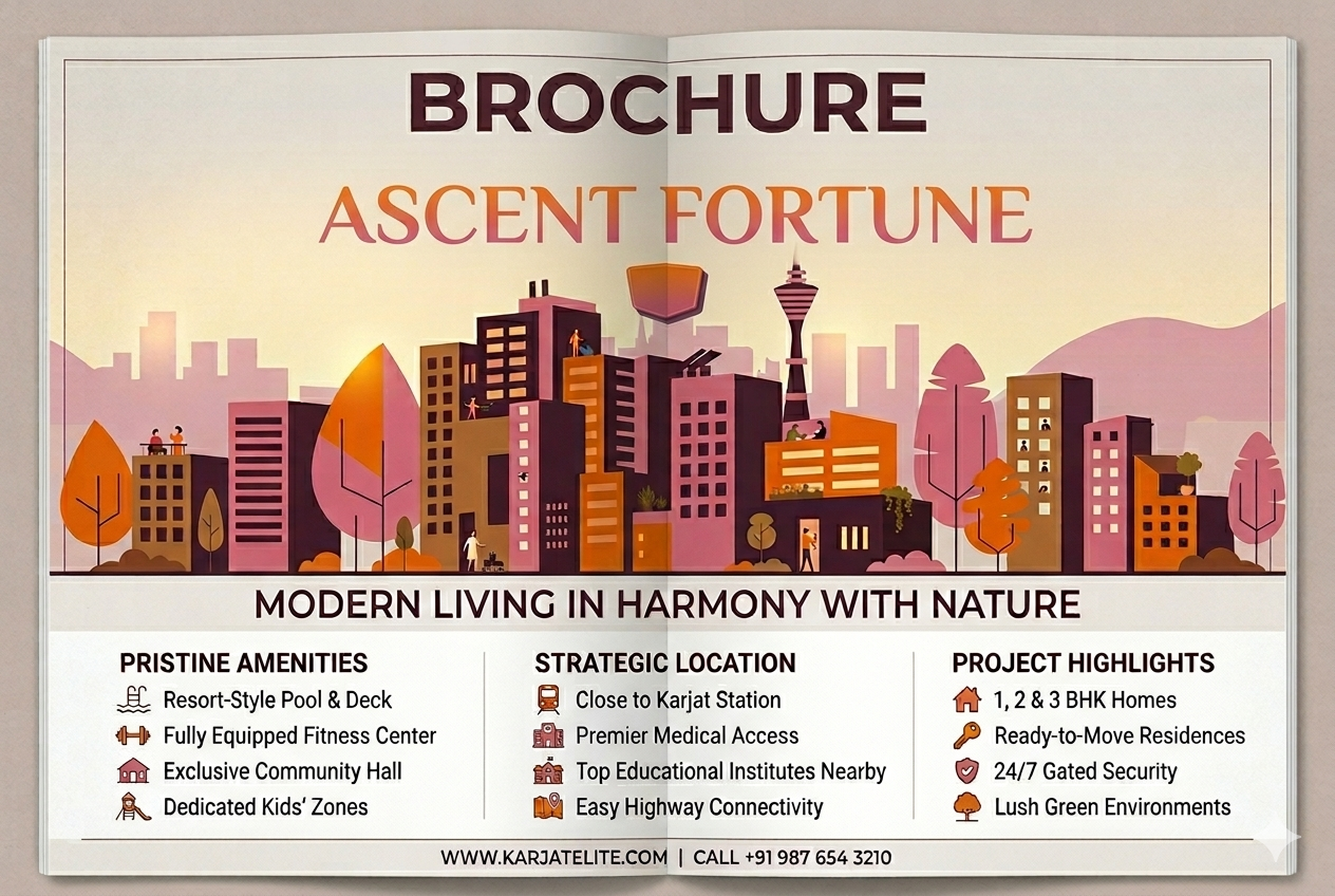 Ascent Fortune is a premium residential project by Ascent Realty, thoughtfully designed with 100% quality construction standards and superior craftsmanship. Built with an earthquake-resistant structure, every aspect reflects strength, safety, and long-term durability. The residences feature elegant interiors, smart space planning, and premium finishes to ensure maximum comfort and customer satisfaction. With a wide range of modern lifestyle amenities for a truly luxurious living experience, the project creates the perfect environment for relaxation, recreation, and everyday convenience. Strategically located in Dahivali, Karjat, it also enjoys seamless connectivity to Mumbai, Pune, and Navi Mumbai